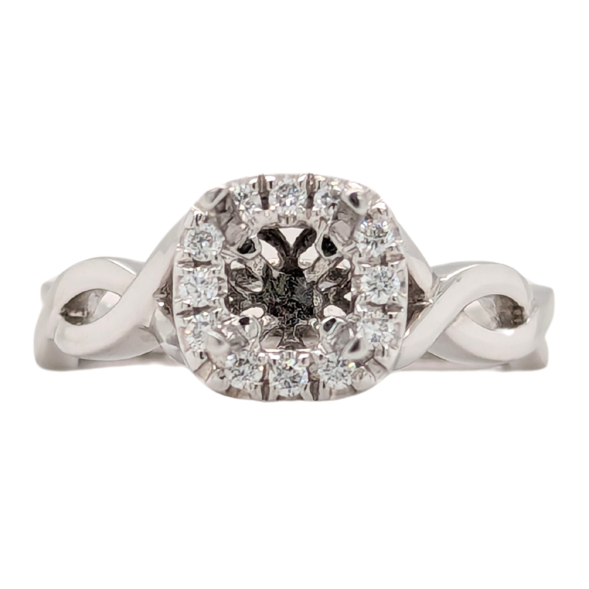 This breathtaking 14K White Gold Diamond Halo Infinity Engagement Semi-Mount Ring is the perfect way to symbolize an infinite love. The twisted shank design adds a unique touch to the classic diamond halo, while the .15CTW diamond accents add sparkle...