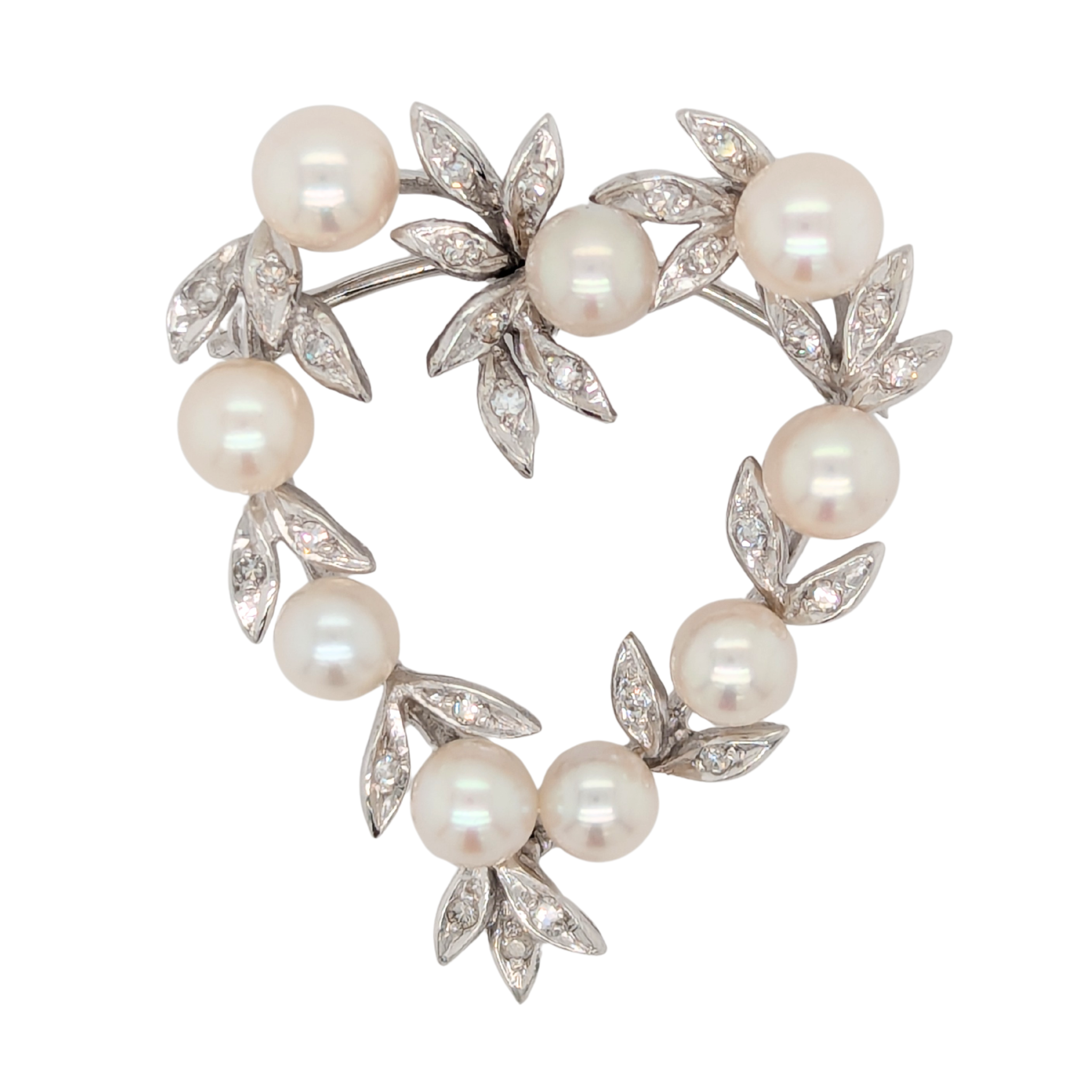 Estate: 14K White Gold Diamond & Pearl Heart Brooch Pin