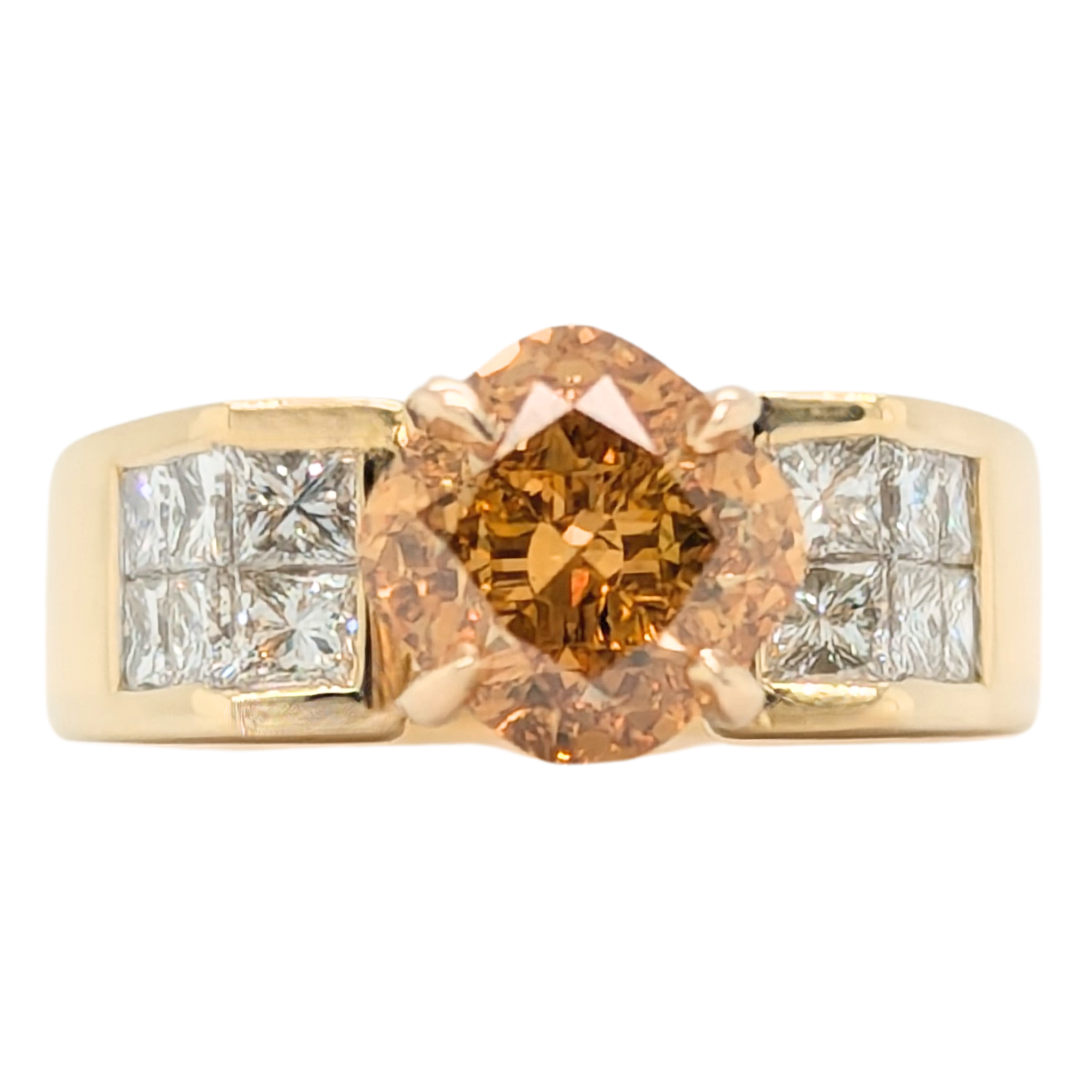 Upgrade your engagement ring game with our Estate collection! This 18K yellow gold ring features a stunning 2.11CT cushion cut diamond in a fancy orange yellow color, adding a unique touch to the classic style. The invisible setting enhances the...