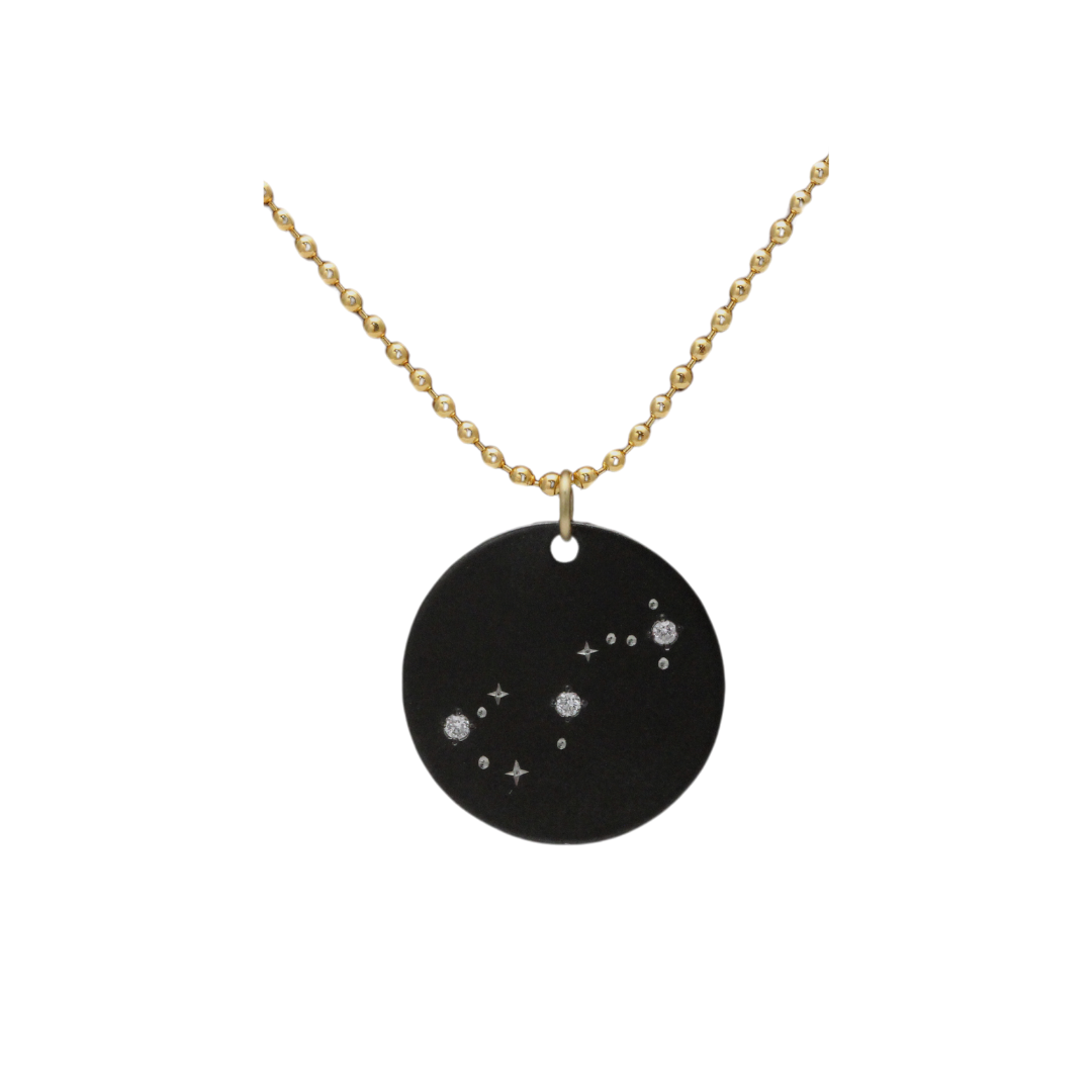 From our Zodiac Collection, this Scorpio pendant is an 18MM round disc in a rich, matte-black zirconium that creates a perfect, night-sky canvas. It features stunning, white-diamond accents. (Three, 1.3MM, flush-set diamonds. F, VS. Lab grown.) Intricate laser engravings complete...