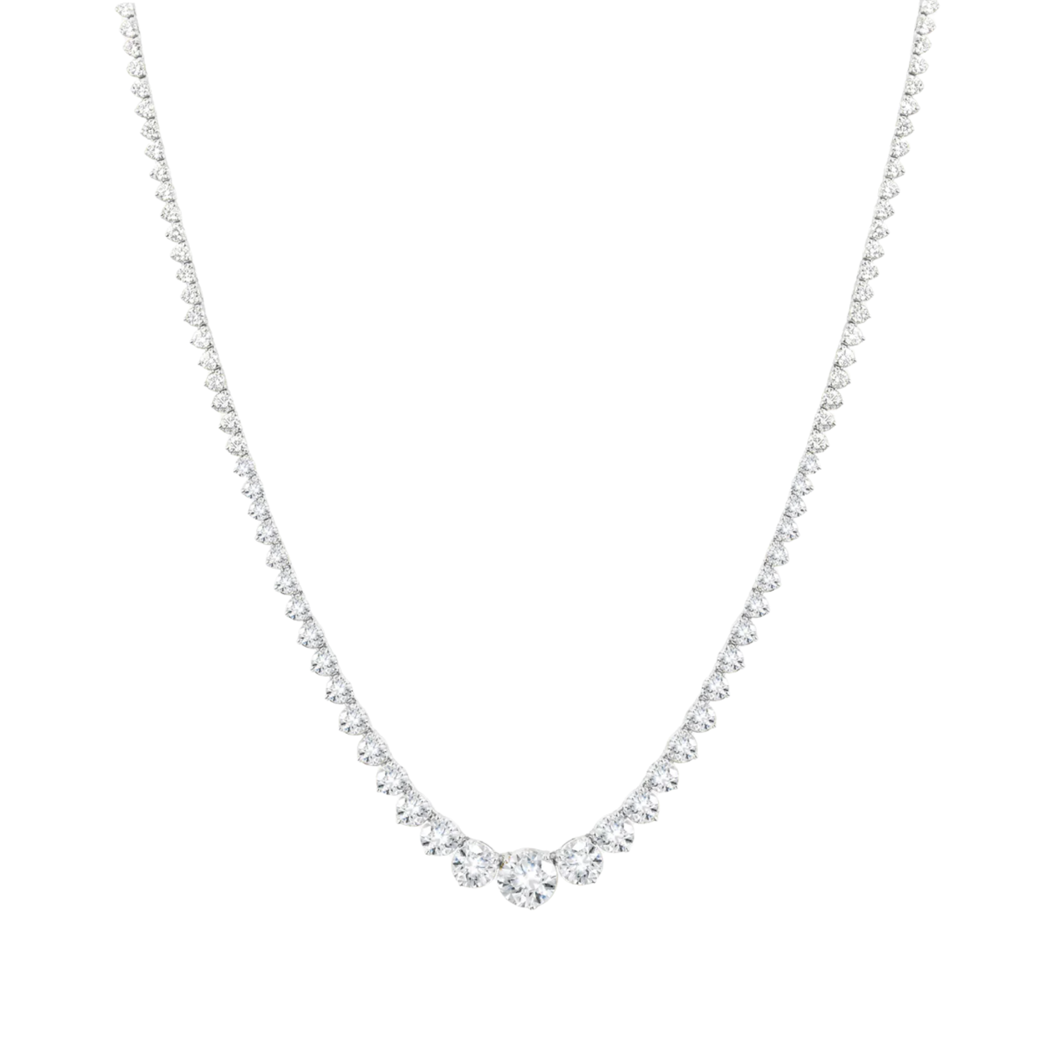 Elevate your elegance with this 17" 14K white gold graduated Riviera necklace, featuring a stunning 3.50 carat total weight of round full-cut diamonds. Each diamond is secured with a refined three-prong design, allowing maximum sparkle and timeless beauty. The graduated...