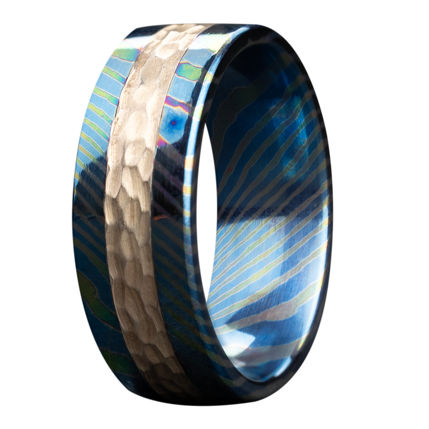 Our moku-ti ring, with a stunning damascus-inspired design, features captivating shades of blues and purples. This unique piece's swirling patterns are complimented with a 3MM sterling silver hammered inlay. This ring's flat shape and added comfort fit make for easy,...