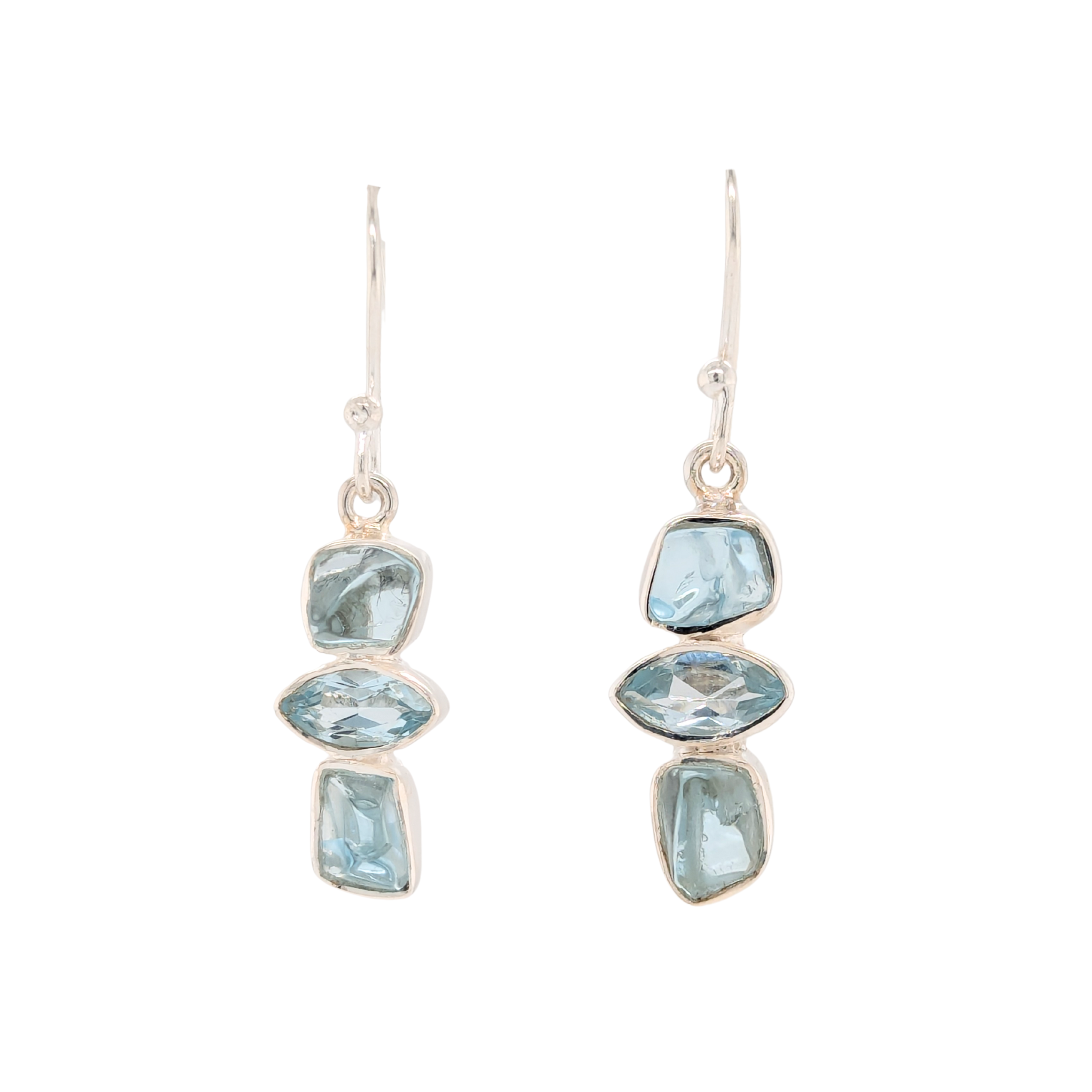 Elevate your style with these sterling silver dangle earrings featuring raw and faceted blue topaz stones. Each bezel-set marquise-shaped gem offers a unique, organic feel that captures natural beauty and light. Perfect for adding a touch of elegance and vibrant...