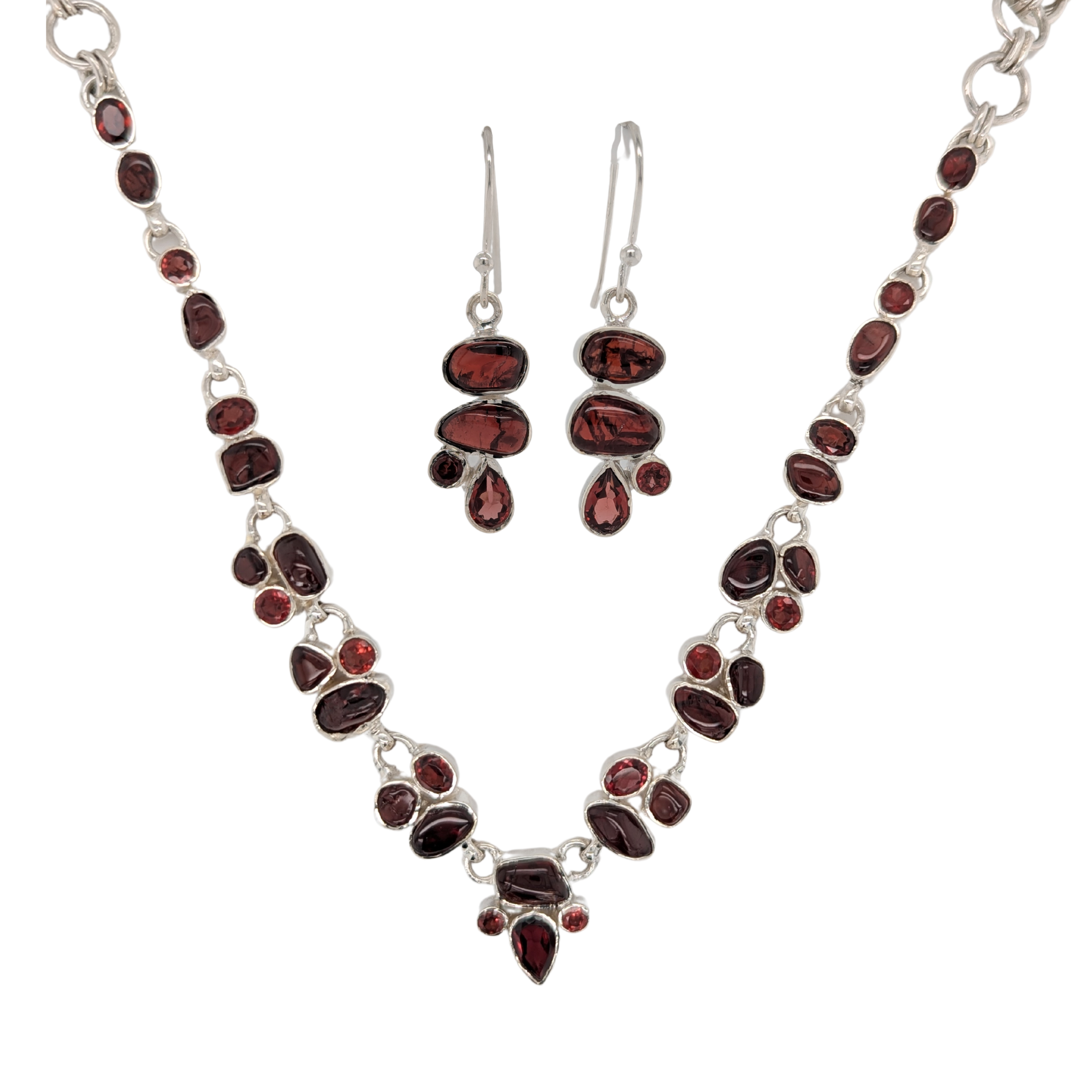 Sterling Silver Garnet Bezel Set Necklace & Earring Set